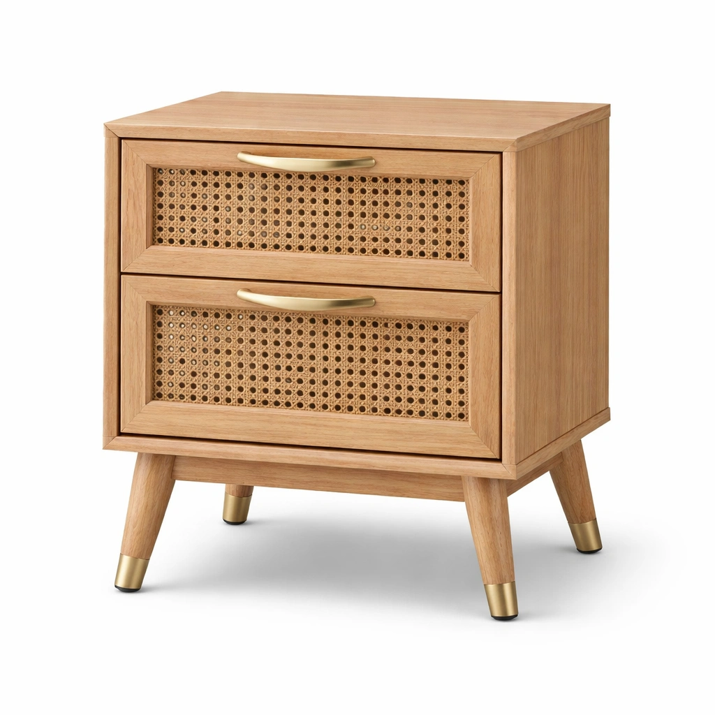 La mesita de noche está fabricada con madera de roble y paneles de ratán natural. Las manijas son de acero inoxidable.